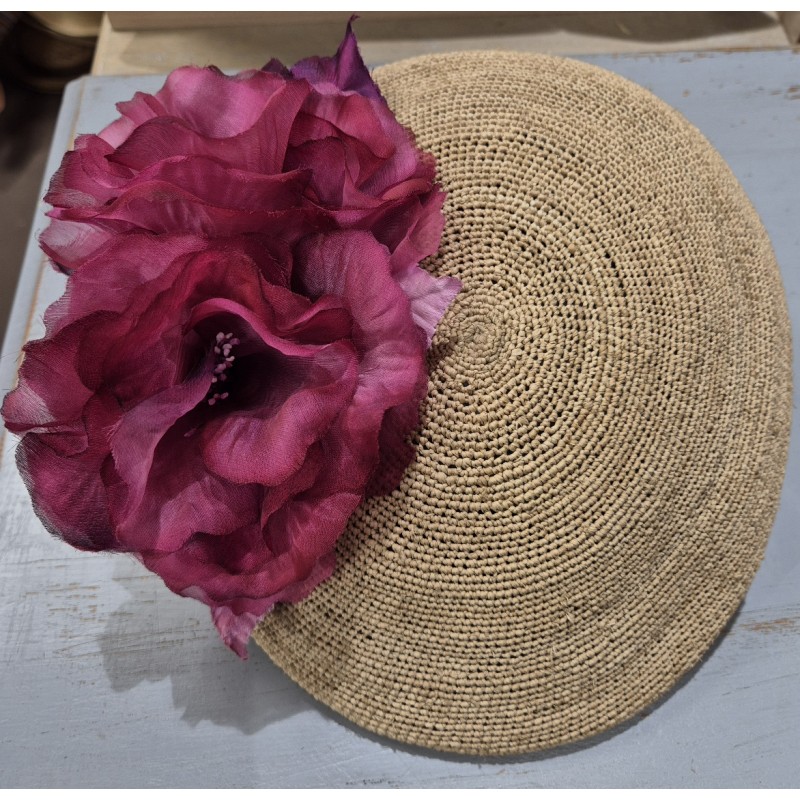 Chic side cap in soft raffia decorated with two fuchsia fabric flowers