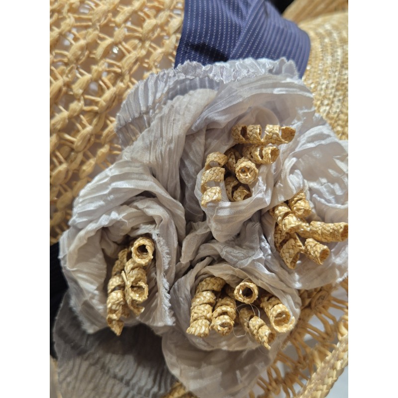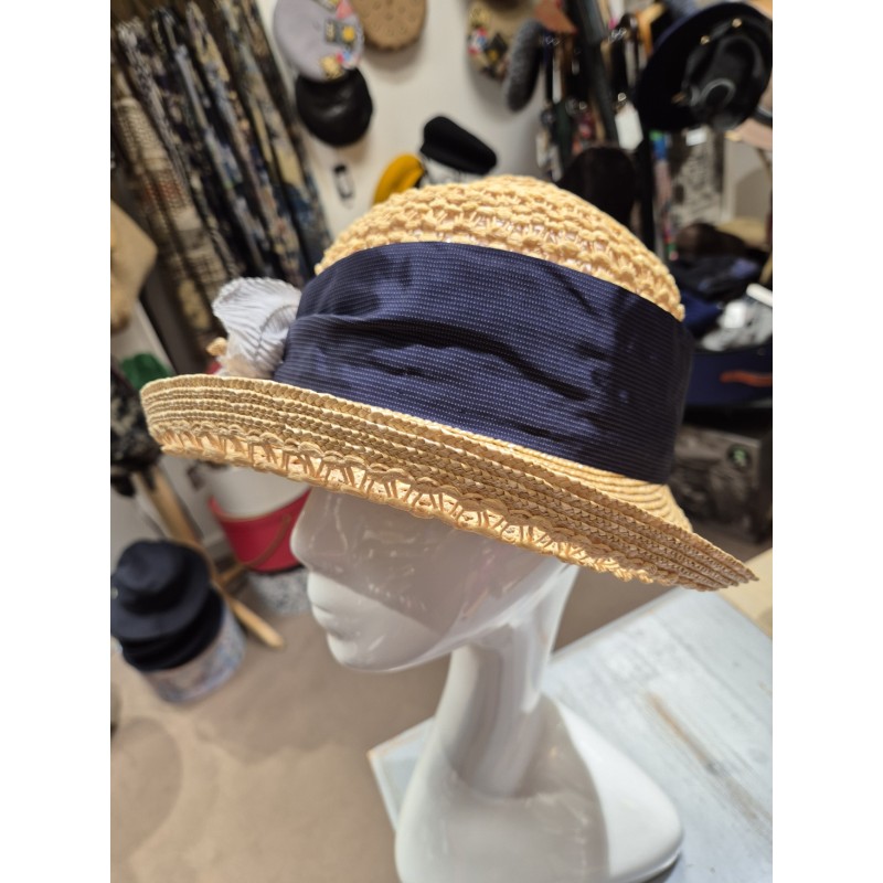 With a raised front brim, the hat is decorated with sewn flowers and a navy blue ribbon with thin stripes.