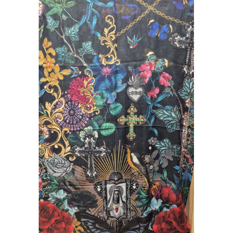 This 95% cashmere and 5% silk stole features a vibrant print full of Paris