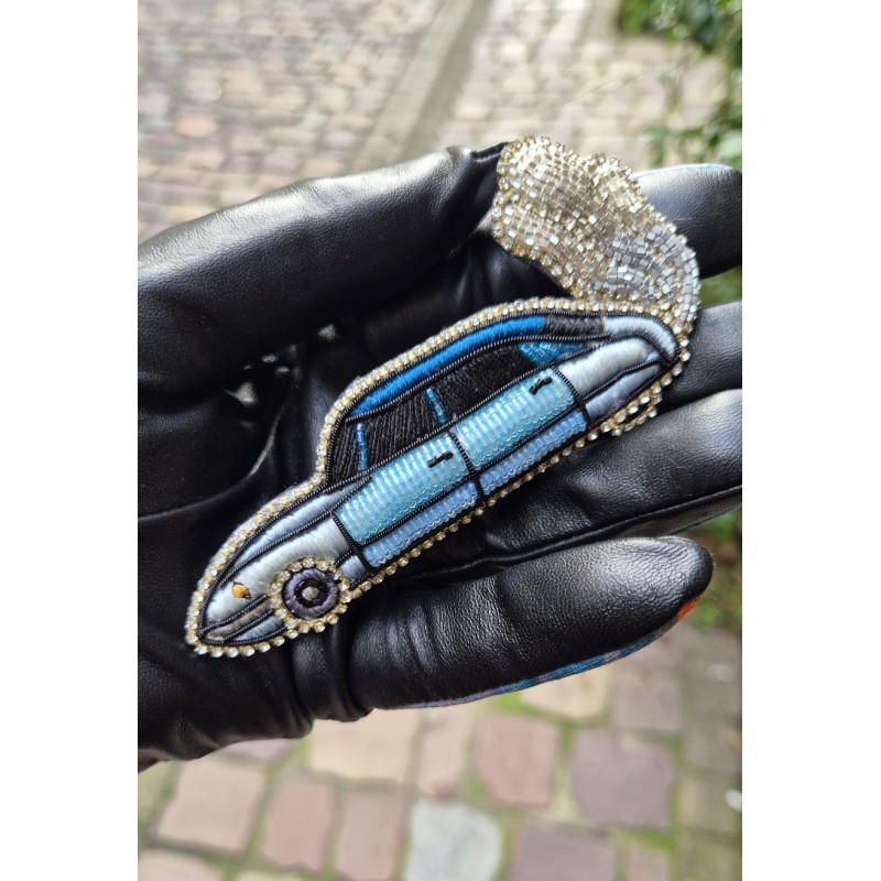 Broche brodée bleue en forme de Citroën DS, voiture mythique au design futuriste. Un hommage scintillant à la French touch automobile des années 60.