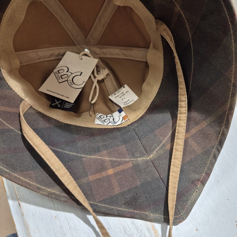 Le bord est plus large au dos pour bien vous protéger de la pluie. Doublé de coton huilé écossais.