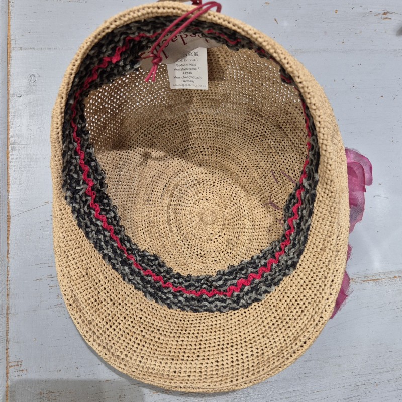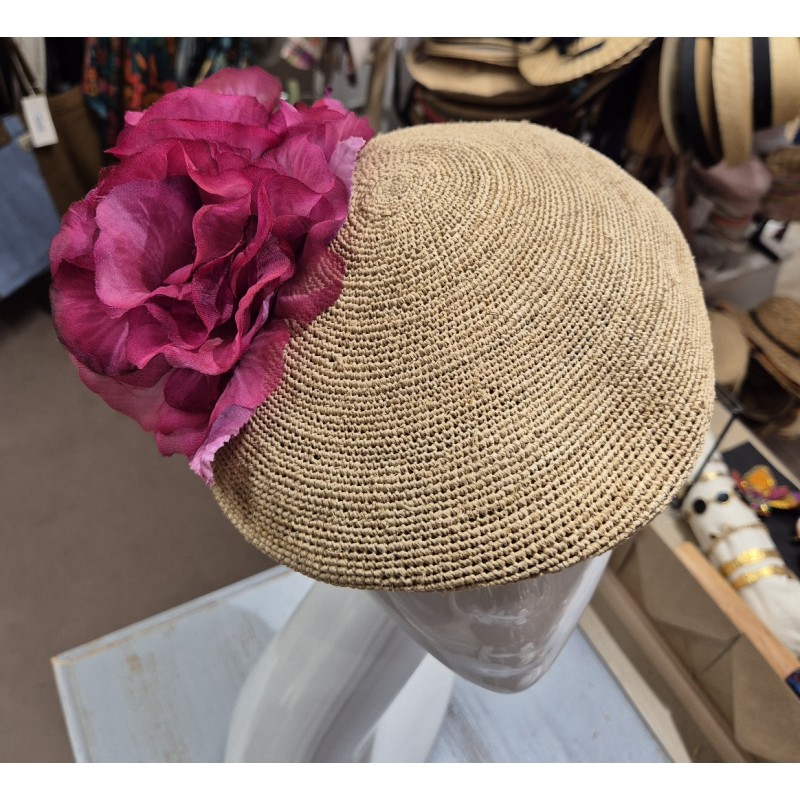 Casquette coté chic en raphia habillée de deux fleurs en tissu coloris fuchsia