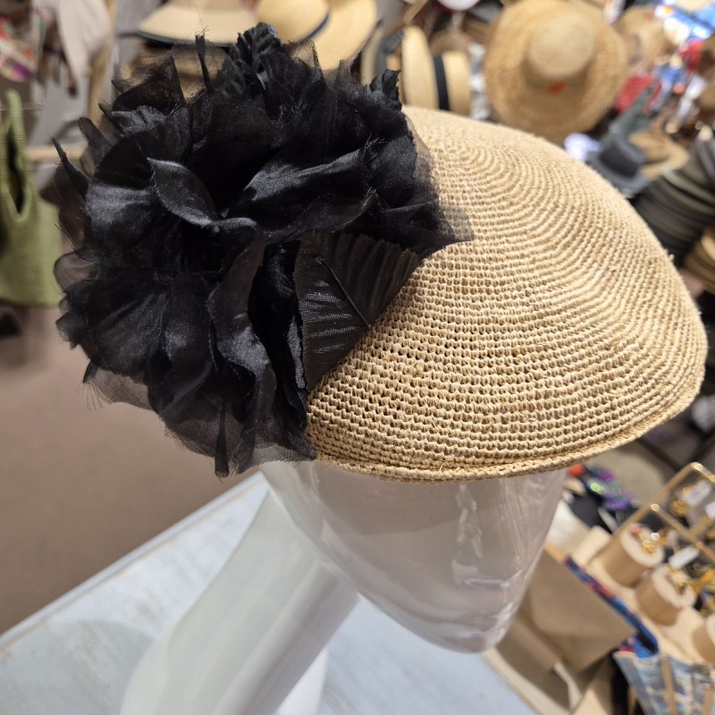 Casquette coté chic en raphia souple habillée de deux fleurs en tissu coloris noir